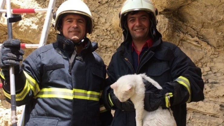 Malatya'nın Darende ilçesinde sarp kayalıklarda mahsur kalan kediyi itfaiye ekipleri kurtardı.