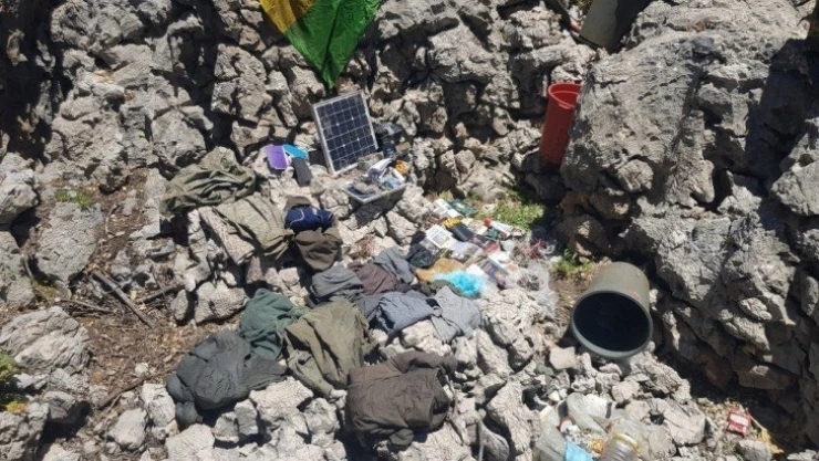 Bidonlarda 1 adet örgüt simgeli bez parçası, 6 adet batarya, 2 adet güneş paneli, 2 adet kablo bağlı pil bloğu, 1 adet radyo, 5 adet not defteri, 12 adet örgütsel kitap, 8 adet el feneri, 400 metre kablo, 1 adet akım ölçer, 1 adet ses kayıt cihazı, 1 adet kuzineli soba, 2 adet kuru akü,1 adet dörtlü ocak,2 çift ayakkabı, 2 adet hafızalı radyo, 1 adet radyo mp3, 1 adet ışıldak, 1 adet akü, 14 adet büyük boy pil, 61 adet küçük pil, 1 adet keser, 1 adet kazma, 1.250 kilogram muhtelif yaşam malzemesi ele geçirildi.