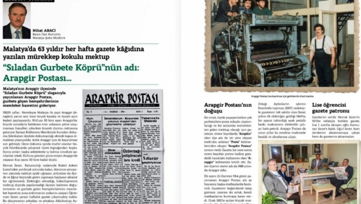 BİK Malatya Şube Müdürü Nihat Abacı'nın derlediği, 'Sıla'dan gurbete köprünün adı, Arapgir Postası' başlıklı araştırma yazısında, Arapgir İlçesinde 63 yıldır haftalık olarak yayımlanan Arapgir Postası Gazetesi'nin kuruluşu, yayın hayatı, gazetenin kurucusu Nevzat Sezer adına vakıf ve müze kurulması konuları yer alıyor.
