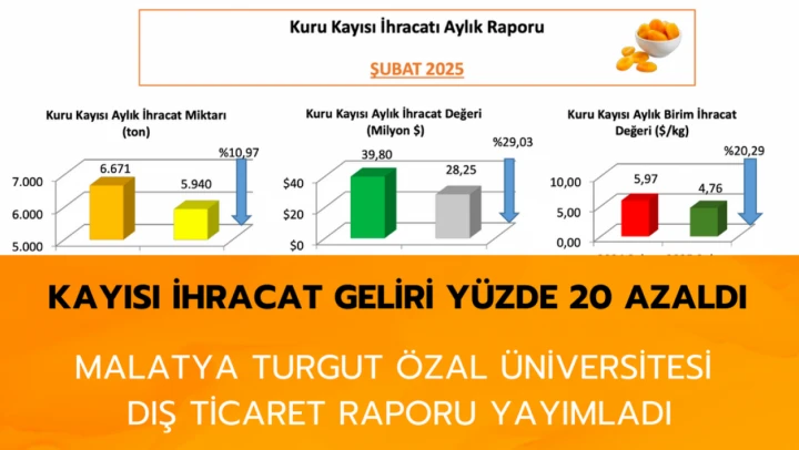 Malatya Turgut Özal Üniversitesi (MTÜ) Kayısı ve Kayısı Ürünleri Geliştirme Uygulama ve Araştırma Merkezinin 2025 yılı Şubat ayı Kuru Kayısı dış ticaret raporu yayımlandı.