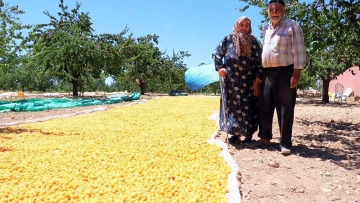 Malatya'nın Akçadağ ilçesinde kayısı hasadı sürerken, ilerlemiş yaşlarına rağmen bahçelerindeki ağır işleri günlük yevmiye karşılığı tuttukları işçileriyle birlikte yapan 78 yaşındaki Kasım ve 70 yaşındaki Havva Erdoğan çifti, emeklerinin karşılığını alamamaktan yakınıyor.