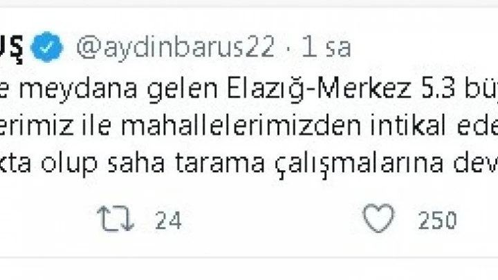 Malatya Valisi Aydın Baruş, sosyal medya hesabından yaptığı açıklamada, “Saat 09.37'de meydana gelen Elazığ merkez 5.3 büyüklüğündeki depremde ilçe merkezlerimiz ile mahallelerimizden intikal eden olumsuz bir durum bulunmamakta olup, saha tarama çalışmalarına devam edilmektedir” dedi.