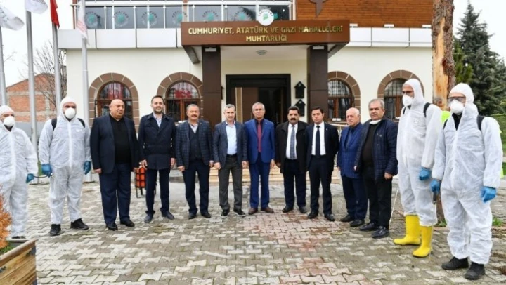 Gazi, Atatürk ve Cumhuriyet Mahalle Muhtarlığının birlikte hizmet verdiği Muhtar Evinde gerçekleşen dezenfektan çalışmalarını takip eden Yeşilyurt Belediye Başkanı Mehmet Çınar, Yeşilyurt'un her noktasında dezenfektan çalışmalarına yoğunluk verdiklerini söyledi.