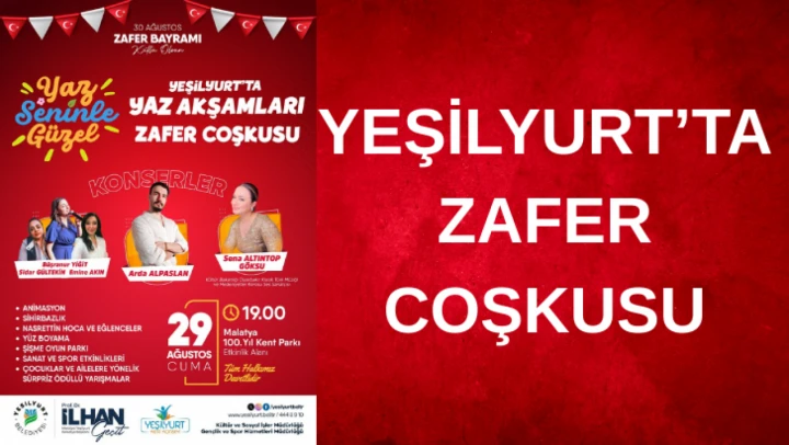 Yeşilyurt Belediyesi, yaz akşamlarını renklendiren kültür ve sanat etkinliklerini 30 Ağustos Zafer Bayramı özel programıyla taçlandıracak. 100. Yıl Kent Parkta gerçekleşecek etkinliklerde, milli birlik ve beraberlik duygusu hep birlikte yaşanacak.
