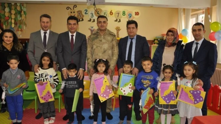 Öğrenciler karnelerini ve hediyelerini İlçe kaymakamı Abdullah Şahin den aldıktan sonra toplu fotoğraf çektiler.