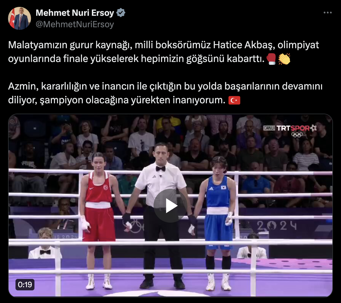 Twitter hesabından bir paylaşımda bulunan Ersoy “Malatyamızın gurur kaynağı, milli boksörümüz Hatice Akbaş, olimpiyat oyunlarında finale yükselerek hepimizin göğsünü kabarttı. Azmin, kararlılığın ve inancın ile çıktığın bu yolda başarılarının devamını diliyor, şampiyon olacağına yürekten inanıyorum.” dedi.