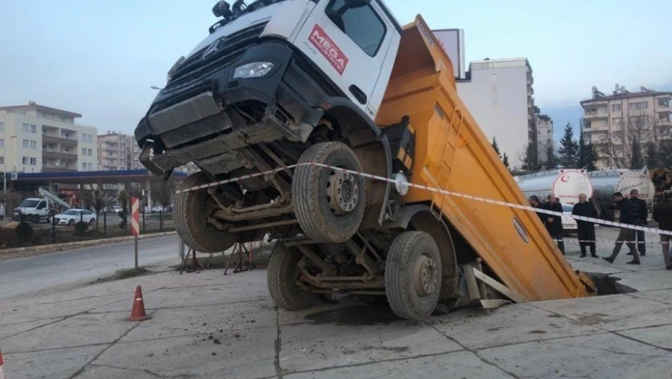 Adıyaman’ın Kahta ilçesinde akaryakıt istasyonunun girişinde mıcır yüklü kamyon, beton zemin çökünce çukura düştü.