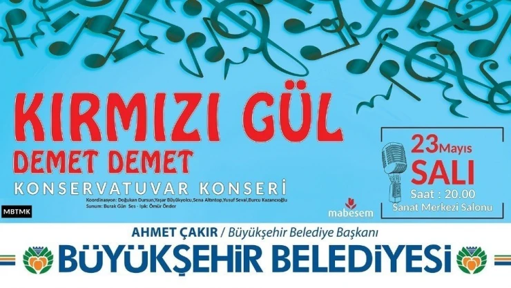 Büyükşehir Belediyesinin 4 korosunun yıl içerisinde verdiği konserlerin yanı sıra Konservatuvar ekibince de konserler düzenlenecek. Sanat Galerisi Çok Amaçlı Salonunda düzenlenecek konserde sevilen Türk Müziği eserleri seslendirilecek. “Kırmızı Gül Demet Demet” adlı ilk konser, 23 Mayıs Salı günü saat 20.00’da başlayacak. Konsere tüm sanatseverlerin davetli olduğu bildirildi.