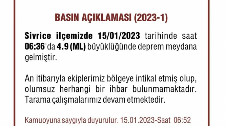 Afet ve Acil Durum Yönetimi Başkanlığı Deprem Dairesi Başkanlığından alınan bilgiye göre, saat 06.36’de merkez üssü Elazığ’ın Sivrice ilçesinde 4.9 büyüklüğünde deprem meydana geldi. Yerin yaklaşık 17 kilometre derinliğinde meydana gelen depremle ilgili olumsuz bir durum yaşanmadığı öğrenildi.