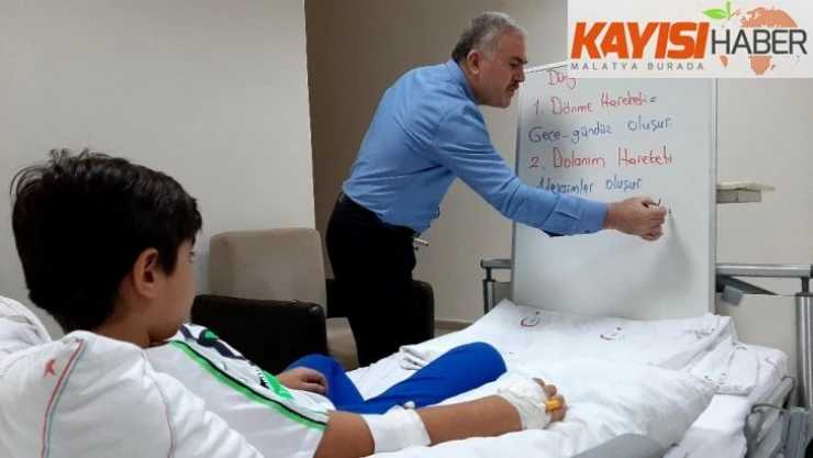 4-H öğrencisi Ahmet Diyarbakırlıoğlu, Adıyaman Eğitim Araştırma Hastanesinde 8 günden beri karaciğer enzim değerlerinin yükselmesi nedeniyle tedavi görüyor. Sınıf öğretmeni Yılmaz Küçükaslan ise öğrencisinin derslerden geri kalmaması için hafta sonu tahtasını ve kalemini alarak hastane odasında öğrencisine sürpriz yaptı. Vefakar öğretmen, hafta içi sınıfta işlenen fen bilgisi ve matematik derslerini tekrar anlattı. Öğrenci velisi hastane odasındaki dersi fotoğraflayıp sosyal medyada paylaşınca öğretmene tebrik mesajları geldi.