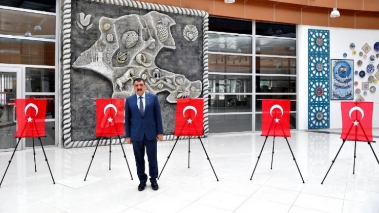 İdlib’te şehit olan Mehmetçik için düzenlenen koreografide, şövaleler üzerinde bayrak sergisi açıldı. MABESEM Sanat Galerisi’nde yer alan sergiyi Büyükşehir Belediye Başkanı Selahattin Gürkan, ziyaret etti. Başkan Gürkan, İdlib’te şehit olan Mehmetçikler anısına özel bayrak koreografisi sergisi düzenlediklerini belirterek, “Şehitlerimizi rahmetle, minnetle yad ediyoruz” dedi.