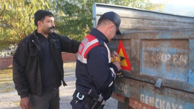 Elazığ'da jandarma trafik ekipleri tarafından, kazaları önleme tedbirleri kapsamında 120 traktörün römorkuna reflektör takıldı, bilgilendirme yapıldı.