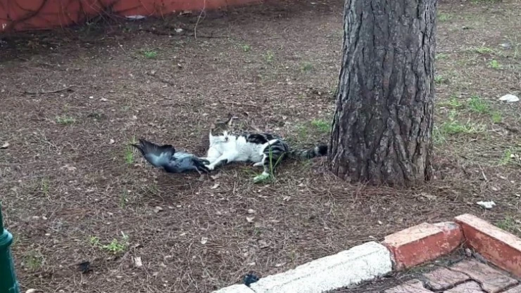 Güvercine pençeleriyle darbe indiren kedi kaçmasını engelledi. Kedinin güvercini parçalamak istediğini gören vatandaşlar güvercini kurtarmak istese de kedi buna müsaade etmedi. Kedi, avını alarak uzaklaştı.