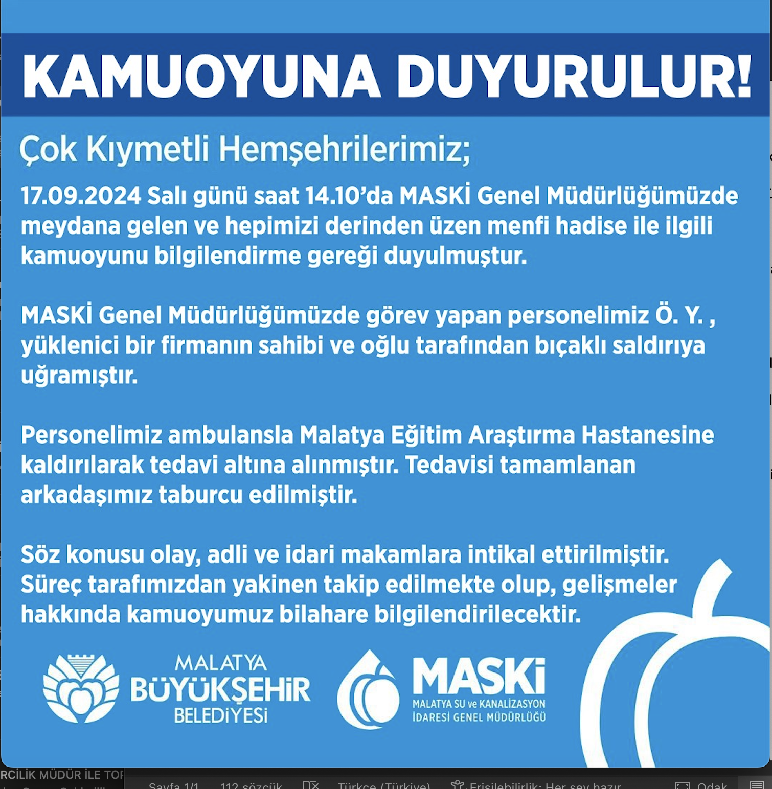 Olayla ilgili MASKİ’den yapılan açıklamaya göre saldırıya uğrayan personelin taburcu edildiği bildirildi.