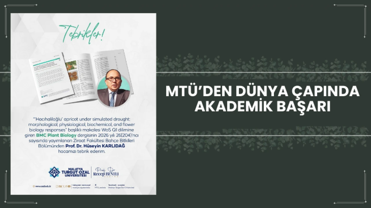 “Üniversitemiz Ziraat Fakültesi Bahçe Bitkileri Bölümü öğretim üyelerinden Prof. Dr. Hüseyin Karlıdağ hocamızın, ‘Hacıhaliloğlu’ apricot under simulated drought: morphological, physiological, biochemical, and flower biology responses’ başlıklı çalışmasının BMC Plant Biology dergisinde (2026, 26. cilt) yayımlanması dolayısıyla hocamızı tebrik ediyor, başarılarının devamını diliyorum.”