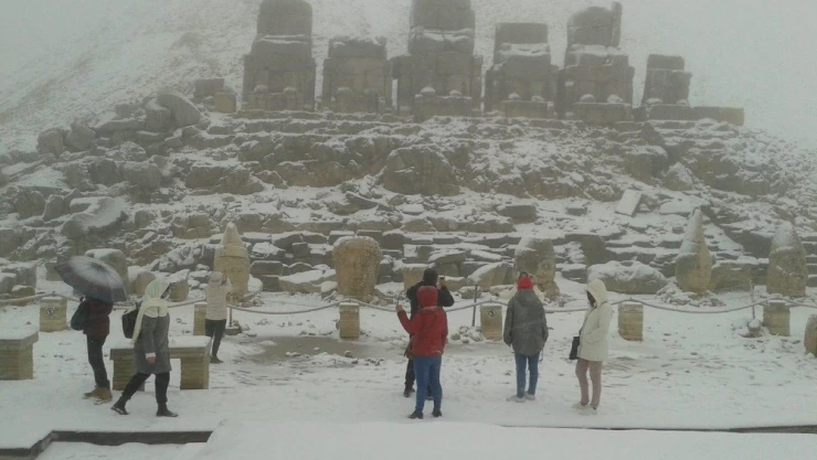UNESCO’nun Dünya Kültür Mirası Listesi’nde yer alan 2 bin 206 metre yükseklikteki Nemrut Dağı’na kar yağdı. Nemrut Dağı zirvesinde bulunan devasa heykelleri görmek, güneşin en güzel manzarayla doğup battığı yer olarak kabul edilen Nemrut Dağı’nda gün batımını izlemek isteyen turistler kar engeline takıldı.