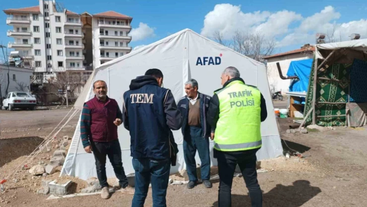 Adıyaman'ın Gölbaşı ilçesinde adresi ilçe dışında olup yardım almak için çadır kuranların belirlenmesi amacıyla polis ekipleri denetimlerini sürdürüyor.