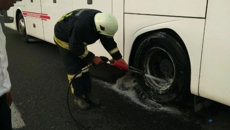 Malatya-Kayseri Karayolunda seyir halindeki bir yolcu otobüsünün tekerinde çıkan yangın büyümeden söndürüldü.