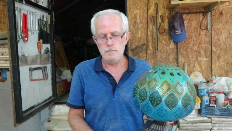 Malatya'da 4 yıl önce hobi olarak su kabağından süs eşyaları yapmaya başlayan 62 yaşındaki Şamil Gülseren evinin bahçesindeki müştemilatında avize, gece lambası ve abajur gibi hediyelik eşyalar üreterek kabakları birer sanat eserine dönüştürüyor.