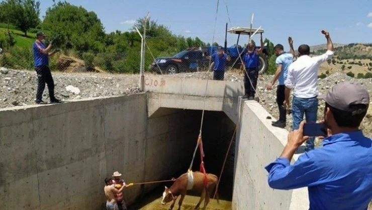 Adıyaman'ın Sincik ilçesinde su kanalına düşen inek, AFAD ve itfaiye ekiplerinin koordineli çalışmasıyla kurtarıldı.