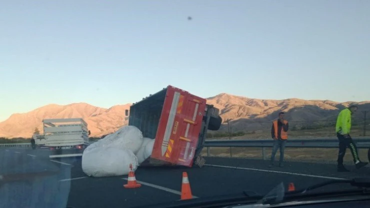 Elazığ’da tekeri yerinden çıkan küspe yüklü römork yan yattı, yaralananın olmadığı kazada küspe boş alana devrildi.