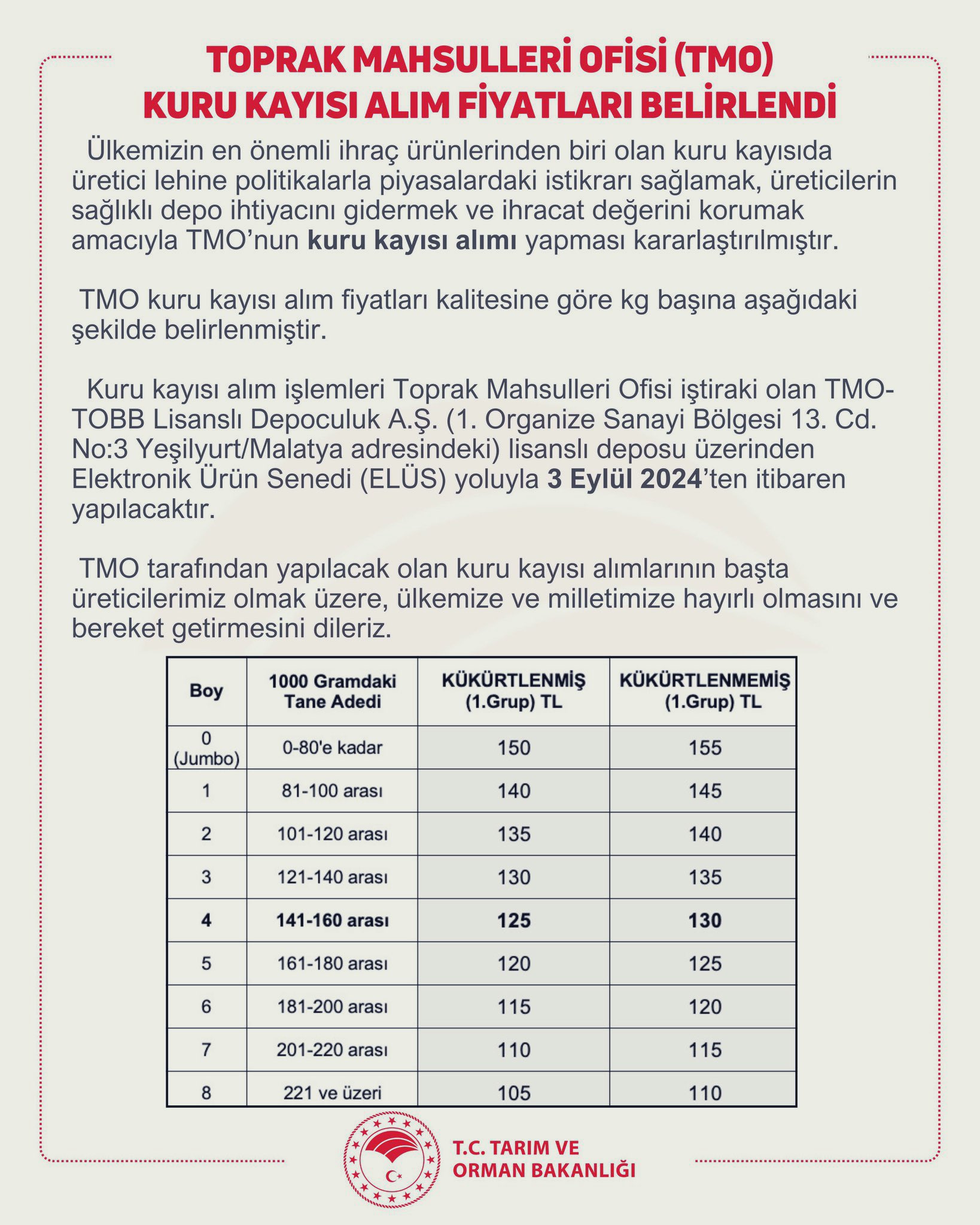 Toprak Mahsulleri Ofisi (TMO) kuru kayısıda taban fiyat açıklaması yaparak ürün alımı yapacağını Tarım ve Orman Bakanlığının sosyal medya hesaplarından duyurdu. 3 Eylül’de başlayacak alım için TMO kükürtlenmiş kayısıda 150 TL, gün kurusu da ise 155 TL olarak en yüksek fiyatları açıkladı.