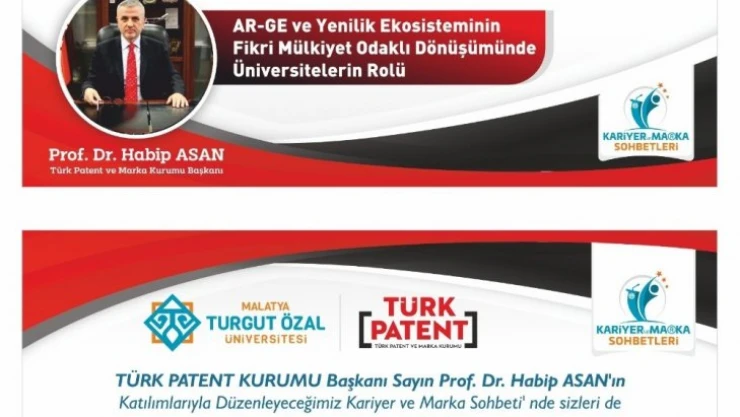 Malatya Turgut Özal Üniversitesi'nde (MTÜ) düzenlenecek olan Kariyer ve Marka Sohbetlerine Türk Patent ve Marka Kurumu Başkanı Prof. Dr. Habip Asan katılacak.