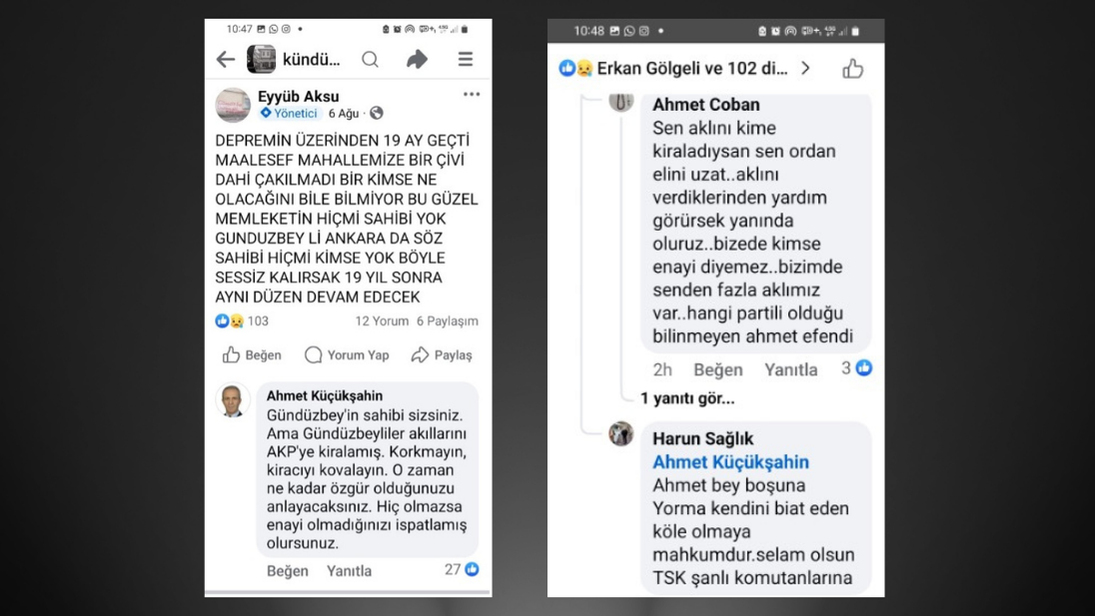 Gündüzbey halkının feryatları, çabaları, suya sabuna dokunmayan konuşmaları devam ederken sosyal medyada 06 Ağustos 2023 günü aşağıdaki paylaşımı gördüm. Bunun üzerine “Gündüzbey’in sahibi sizsiniz. Ama Gündüzbeyliler aklını AKP’ye kiralamış. Korkmayın, kiracıyı kovalayın. O zaman ne kadar özgür olduğunuzu anlayacaksınız. Hiç olmazsa enayi olmadığınızı ispatlamış olursunuz.“ diyerek, mevcut durumdan kurtulmanın ve hükümete karşı ciddi bir varlık göstermenin yolunu ifade etmeye çalıştım. Bunun üzerine tanıdık bir kişiden aşağıda ifade edilen yorumu aldım. Yorumun sonunda “… hangi partili olduğu bilinmeyen ahmet efendi“ diyerek cümleyi tamamlıyordu. Yani beni aşağılamaya, küçük düşürmeye çalışıyordu.