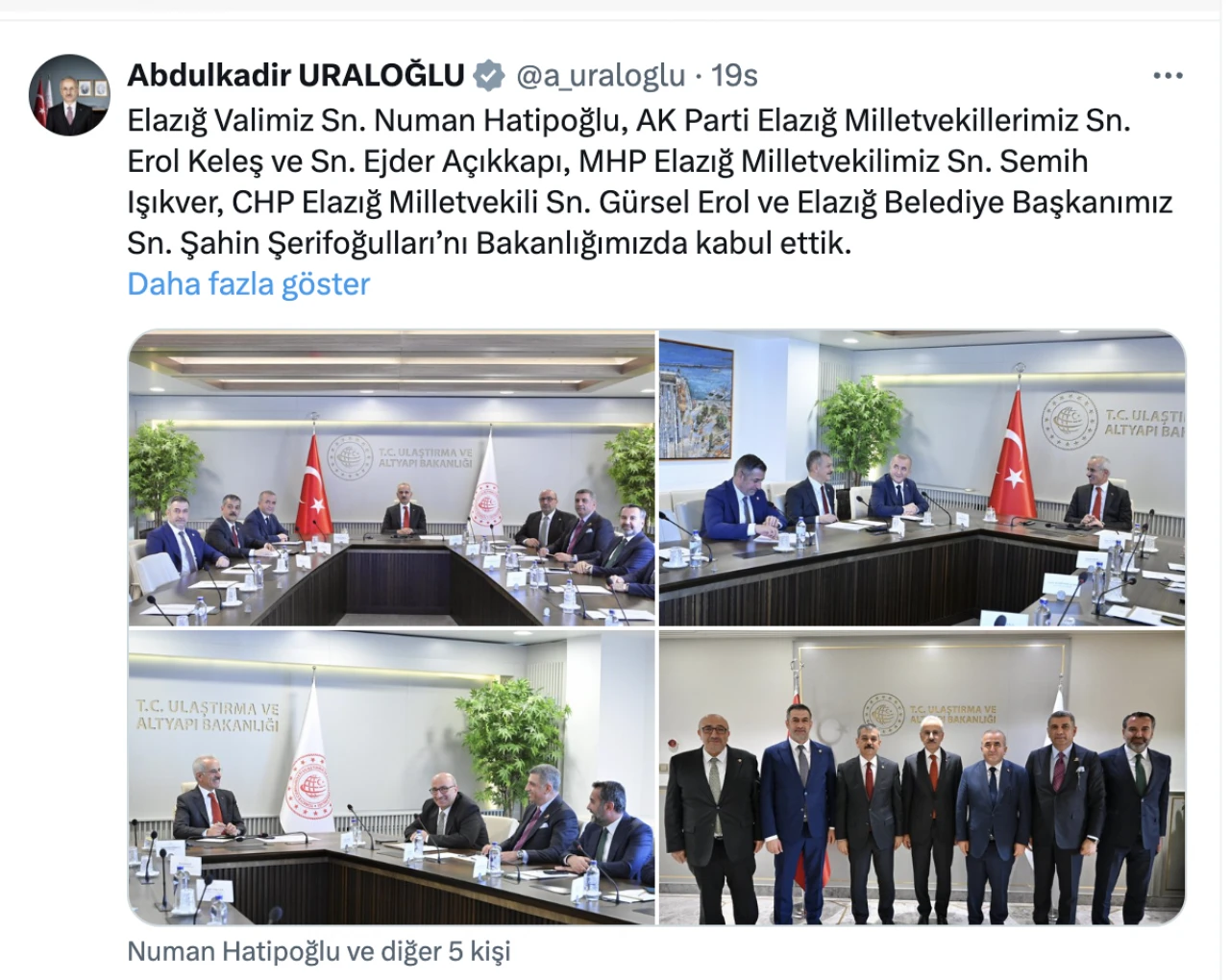 Elazığ’ın söz sahipleri, muhalefeti, belediye başkanı, valisi, il başkanları hatta Çevre, Şehircilik ve İklim Değişikliği İl Müdürü de dahil hem Murat Kurum’u hem de Ulaştırma Bakanı Uraloğlu’nu ziyaret etmişler.