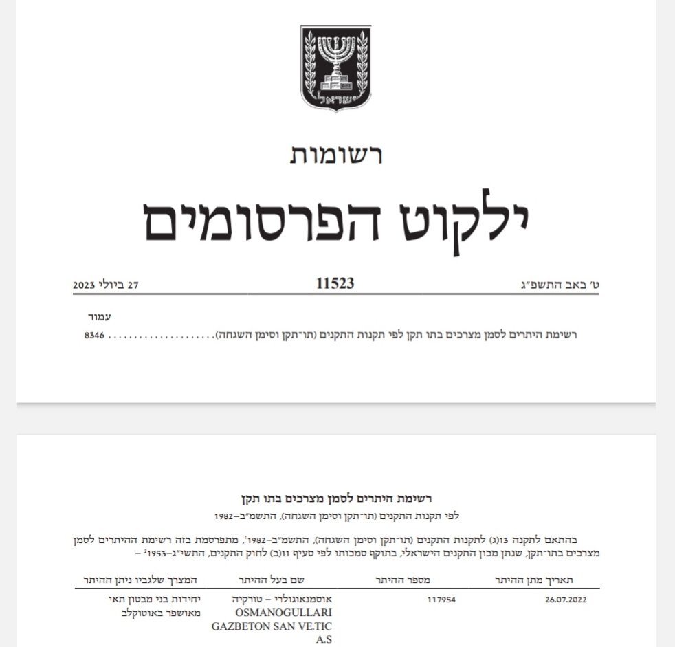 Bu belgeye göre İsrail Ticaret Bakanlığı, 26 Temmuz 2022 tarihinde Mehmet Çınar’ın aile şirketi OSMANOĞULLARI GAZ BETON’a, “Prefabrik beton üniteler” kategorisinde “117954” izin numarası ile mal satabilir izni vermiş.