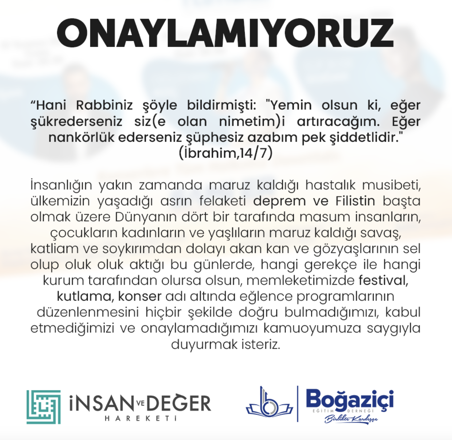 Koronavirüsten girip depremden devam edip Filistin’deki soykırımla es verip Kayısı Festivali adı altında eğlence ve konserlere karşı olduklarını ve onaylamadıklarını söylemişler.