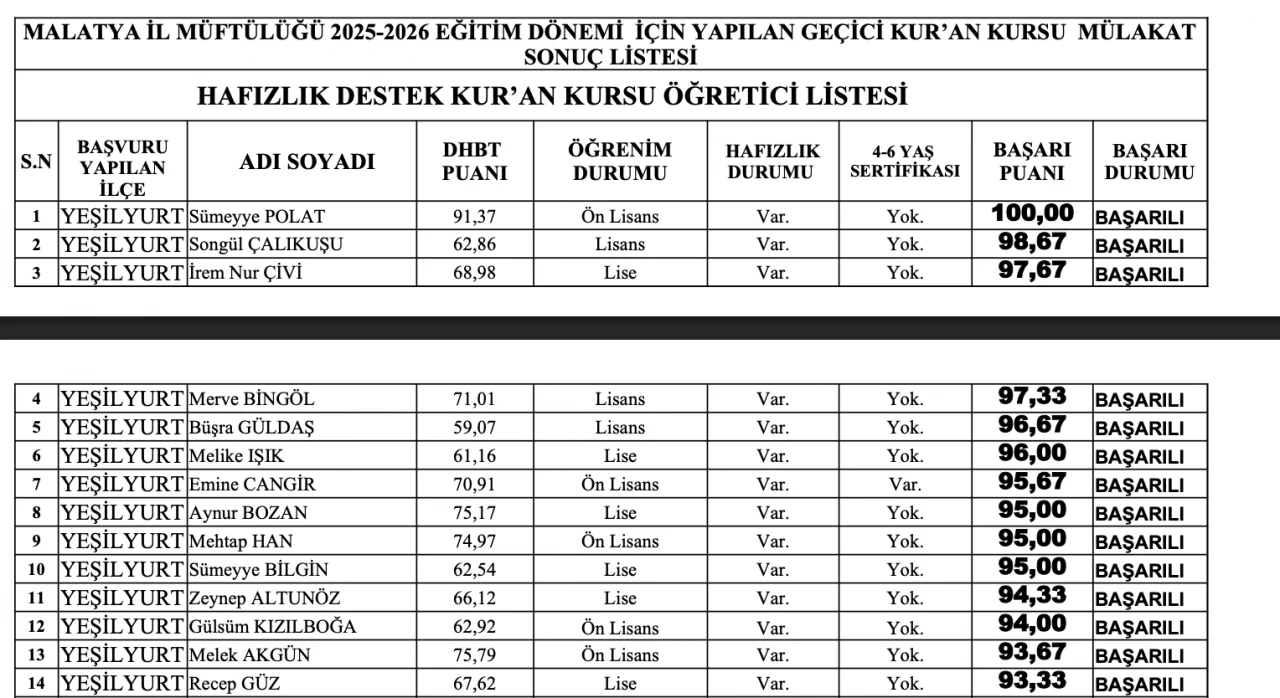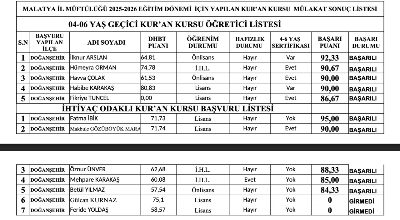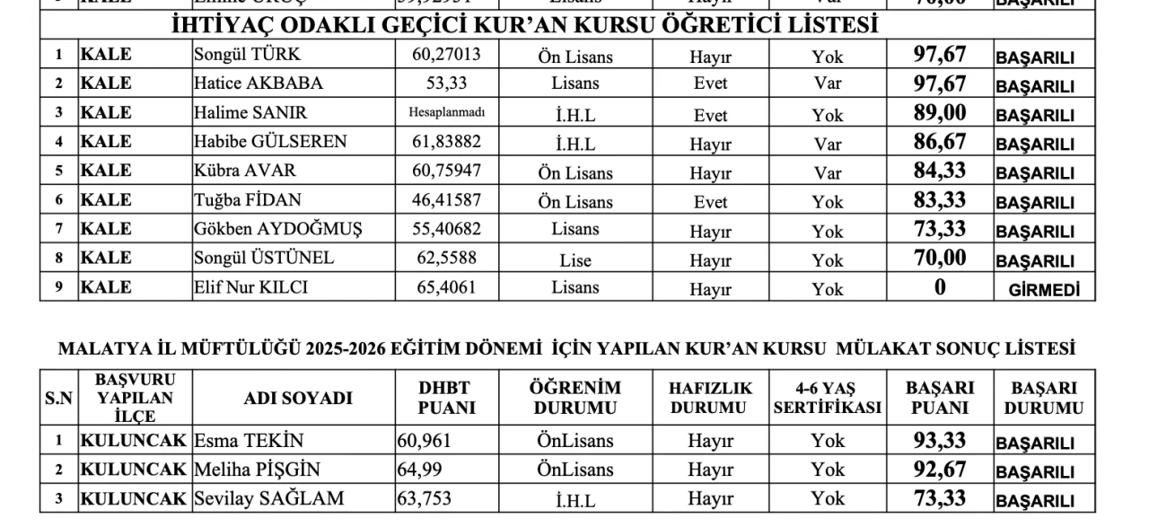 Malatya İl Müftülüğü’nün resmi internet sayfasında bu sınav sonuçları yayımlandı.