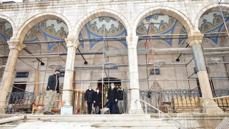 Vali Aydın Baruş, depremden zarar görmesi nedeniyle tadilata alınan Yeni Cami'deki çalışmaları inceledi.