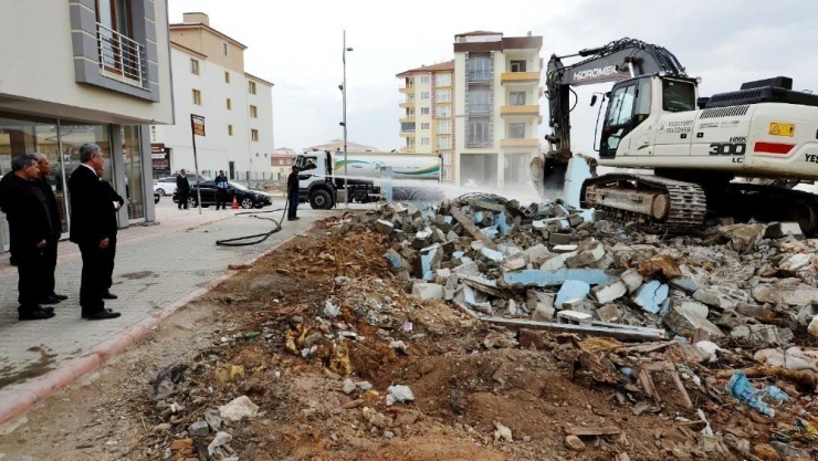 Yıkım çalışmalarının çevreye zarar vermemesi için İtfaiye aracından yıkım sonuçlanıncaya kadar su sıkıldı ve yıkım anındaki tozun çevreye yayılması önlendi.