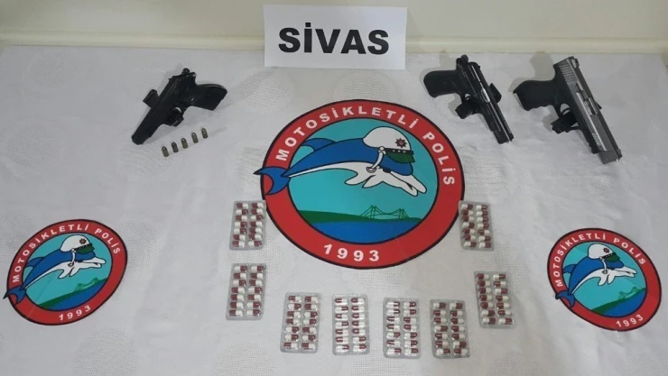 Sivas’ta genel huzur ve sükun ortamının devamının sağlanması amacıyla İl Emniyet Müdürlüğü Asayiş Şube Müdürlüğüne bağlı motosikletli polis ekipleri tarafından gerçekleştirilen çalışmalarda 7.65 milimetre çapında 1 ruhsatsız tabanca, 5 fişek, iki kuru sıkı tabanca ve 112 uyuşturucu hap ele geçirildi. Şüpheliler hakkında inceleme başlatıldı.